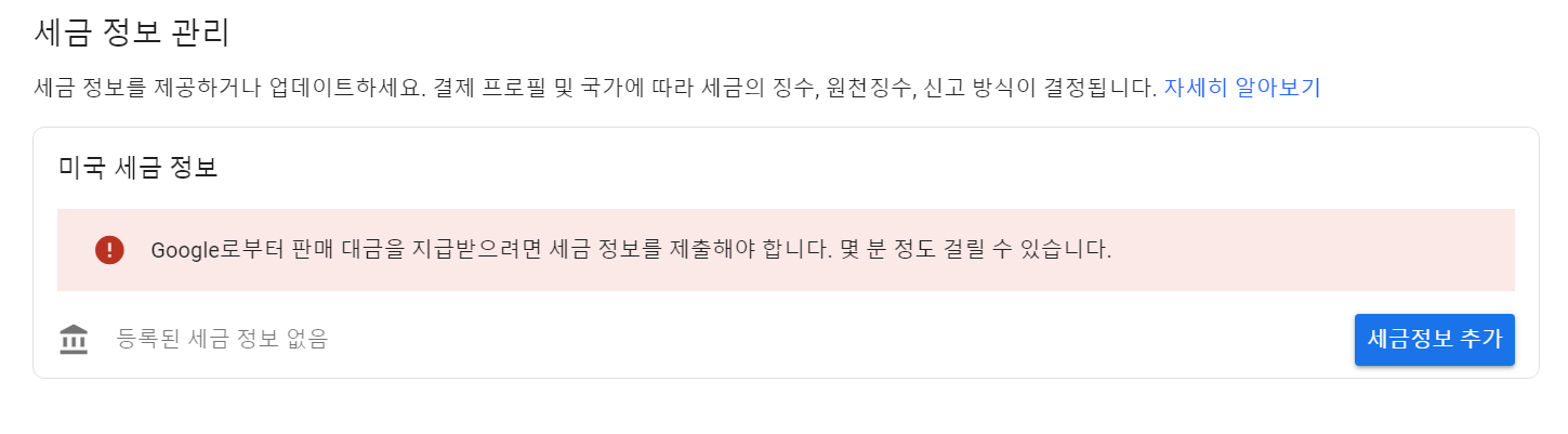 세금 정보 관리에 내용을 입력하지 않으면 애드센스 수익을 지급받을 수 없으므로 세금정보를 추가 합니다.