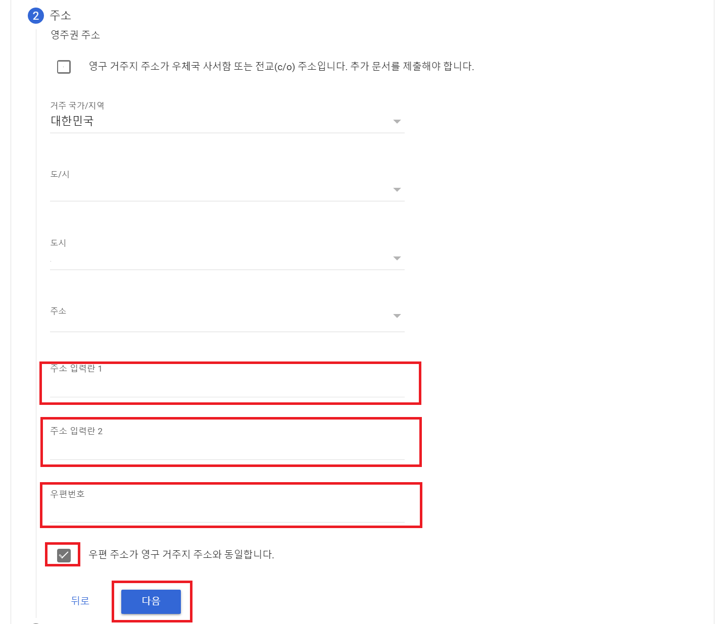 주소를 선택하여 입력하고 주소 입력란1, 2 에는 영문 주소로 입력을 합니다.