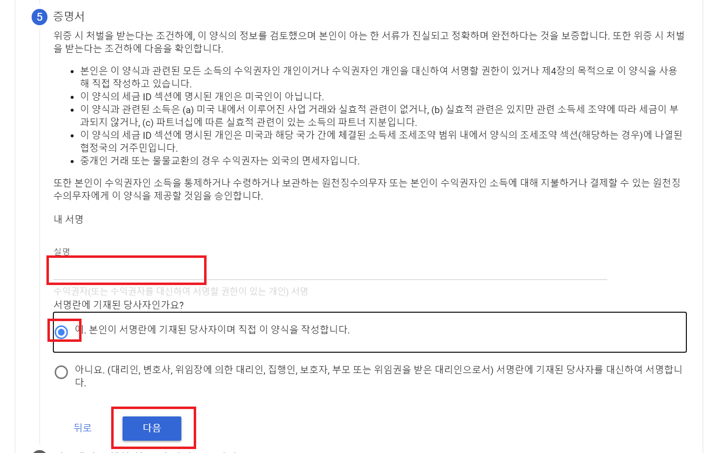 미국에서 얻은 수익이 있다면 "예"를 선택하시고 아니라면 "아니요"를 선택합니다.