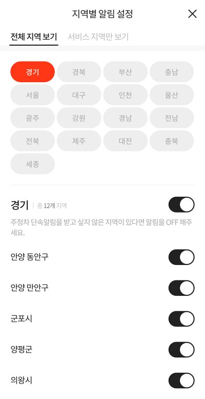 전체메뉴에서 지역별 알림 설정에 들어가면 설정 가능한 지역이 나옵니다.