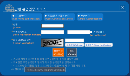 - 공동인증서(구 공인인증서) 또는 간편인증(네이버, 카카오 등)을 통해 본인 인증을 진행합니다.