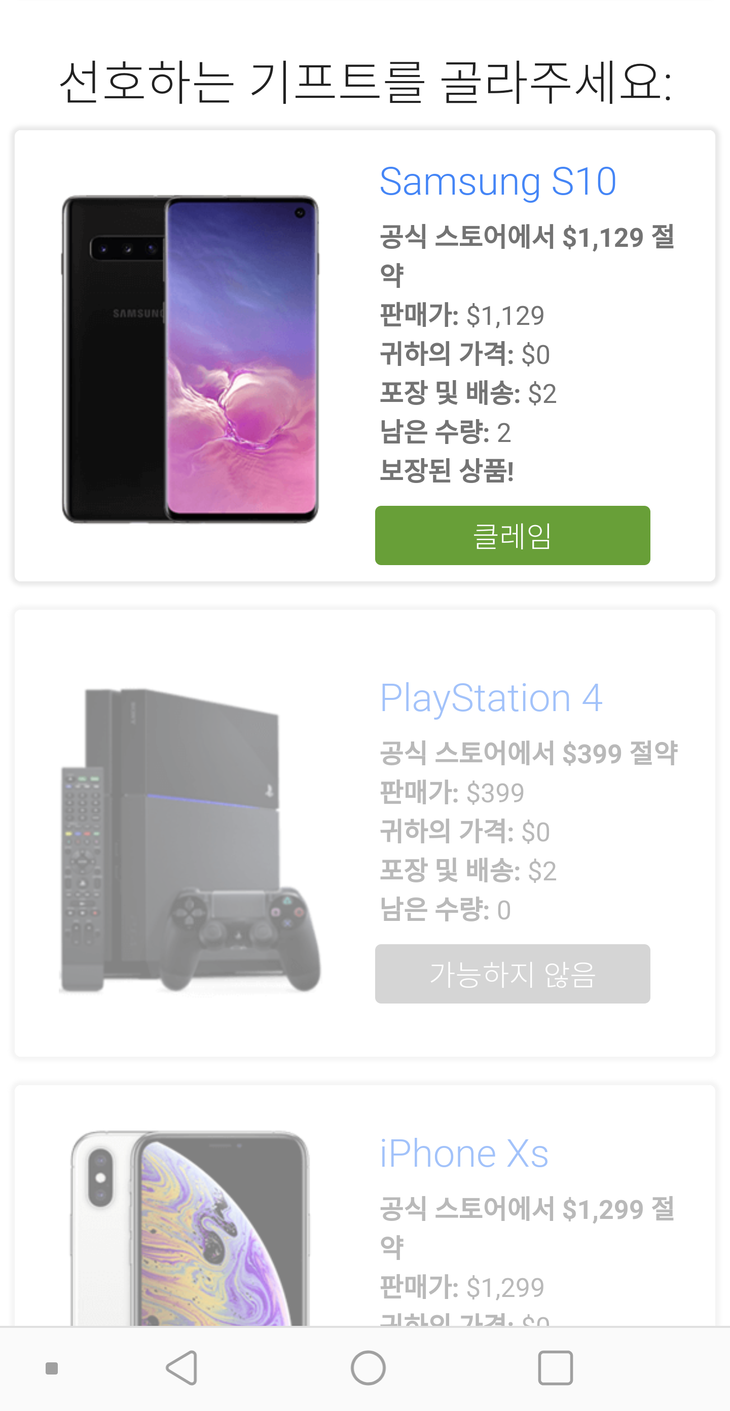 선호하는 기프트는 Samsung S10 으로 선택을 해본다