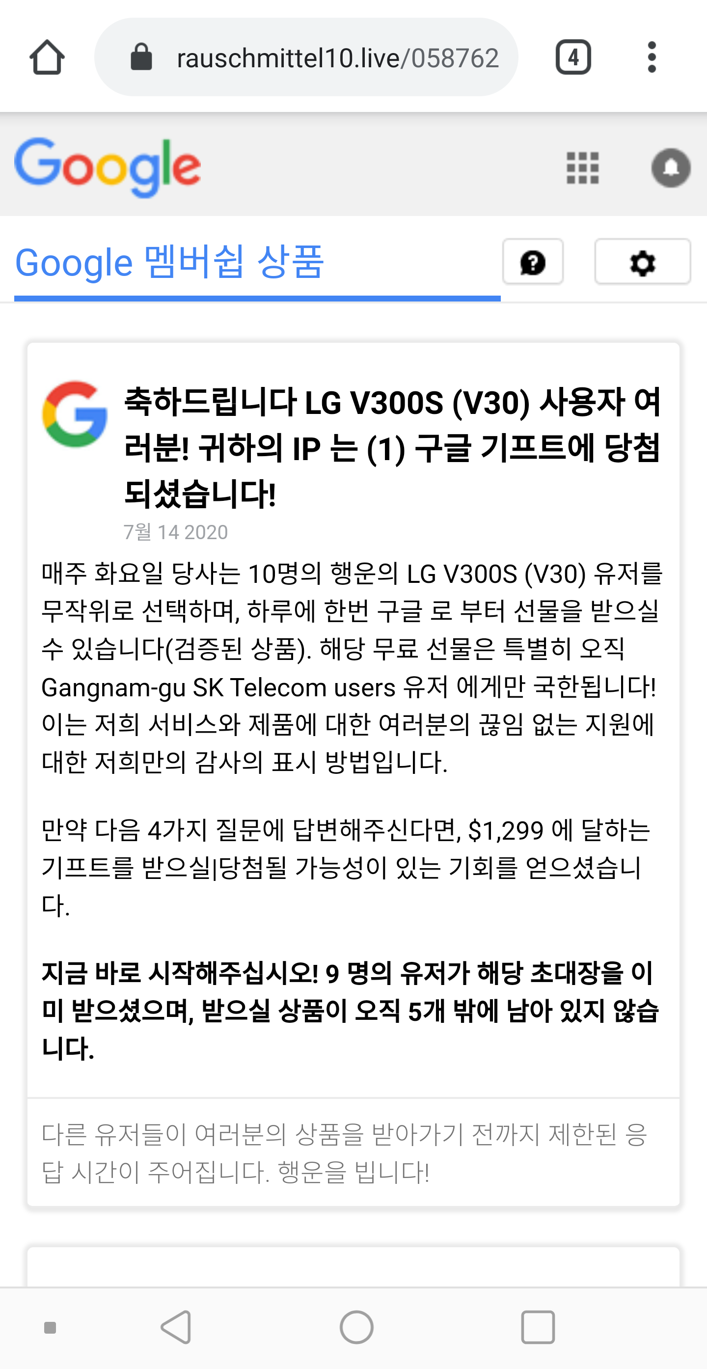 "축하드립니다 LG V300S(V30) 사용자 여러분! 귀하의 IP는 (1) 구글 기프트에 당첨 되셨습니다!"