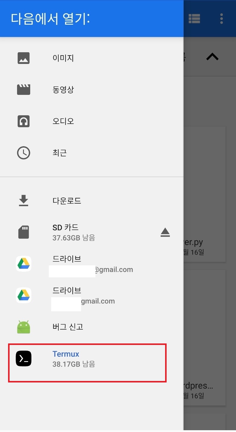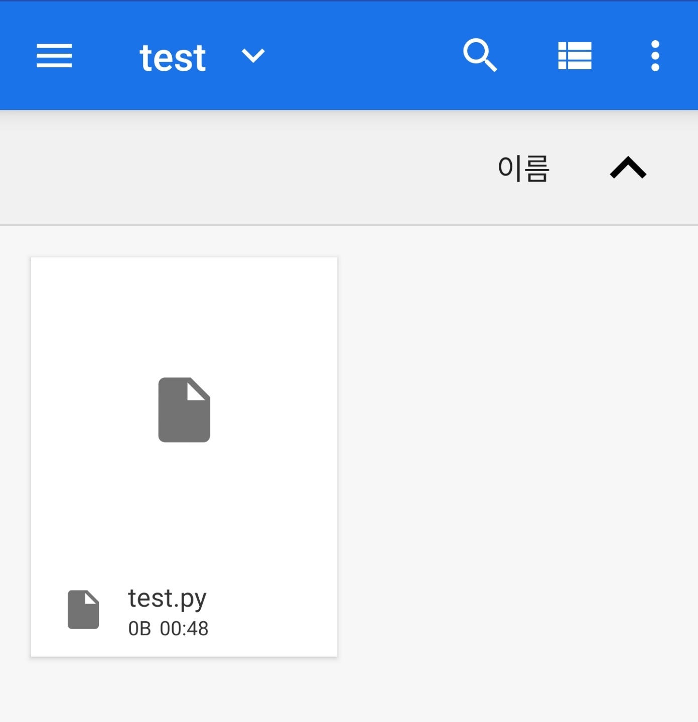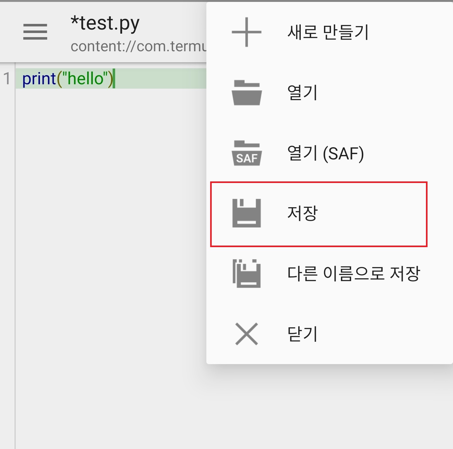 열기(SAF) 로 Termux 를 선택하면 Termux 의 기본 폴더에 생성한 test.py 파일이 보일 것이다.