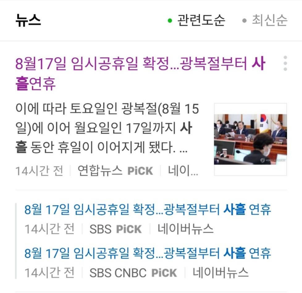 8월17일 임시공휴일 확정으로 인해 광복절부터 사흘연휴라는 기사에